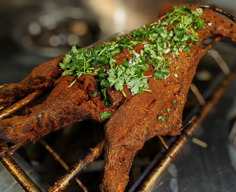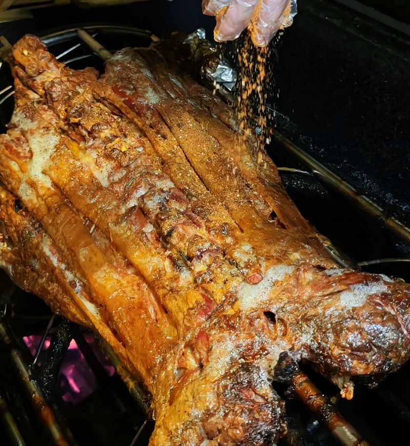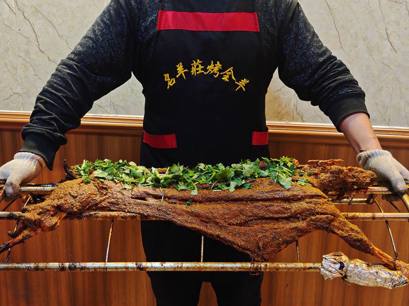 特色的闷炉烤法,是名羊庄烤全羊的灵魂所在。炉底铺足炭火,以恒温热力慢烤而非明火直炙,既能牢牢锁住羊肉本身的汁水,又能让香气慢慢渗透肌理。