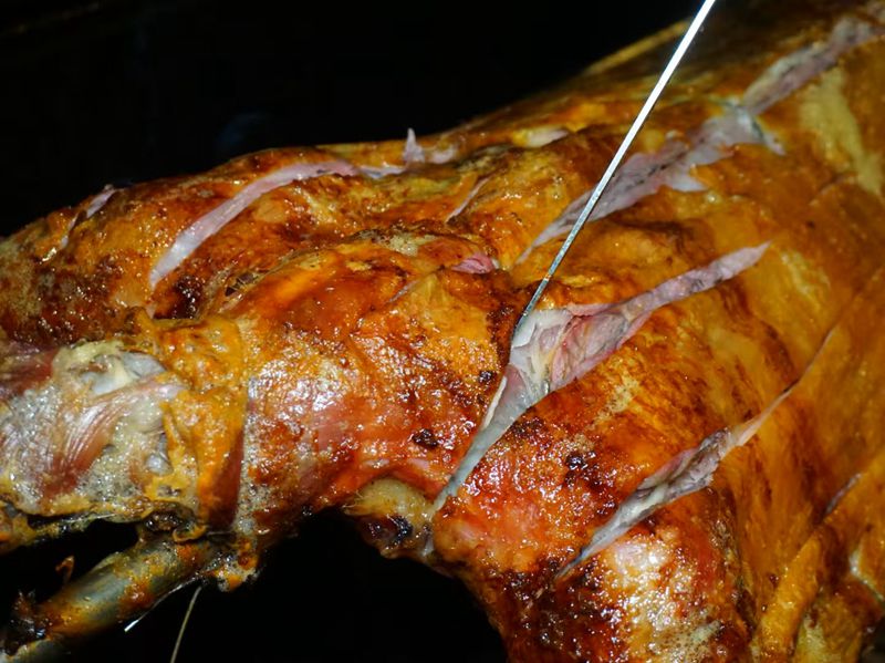 等待烤羊的间隙,家人围坐闲聊,或者棋牌休闲娱乐,看着窗外的景致,时光仿佛都慢了下来。不多时,烤羊便带着焦香上桌,金黄酥脆的羊皮轻轻一掰就掉渣,内里的羊肉嫩得能掐出汁,一刀切下,肉香与炭火香瞬间弥漫。