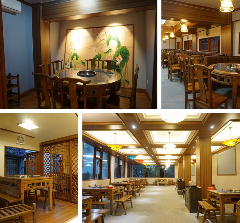 名羊庄烤全羊,环境堪称团圆聚餐的加分项,将园林雅致、古建筑韵与城市盛景完美融合。步入店内,木质阁楼错落有致,雕花窗棂勾勒出古典韵味,廊下绿植点缀,流水潺潺,一步一景皆是意趣。