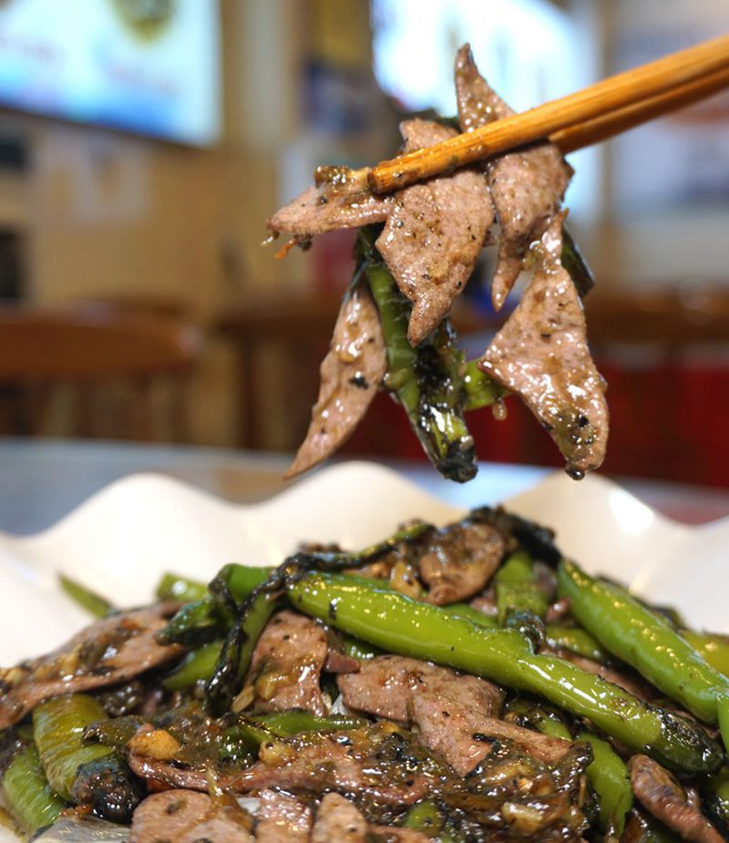 作为“福满轩”的核心特色菜:烧椒猪肝,是老板胡建的自创菜品。这道菜的出堂,源于他对重庆味道的深刻理解与多年钻研。