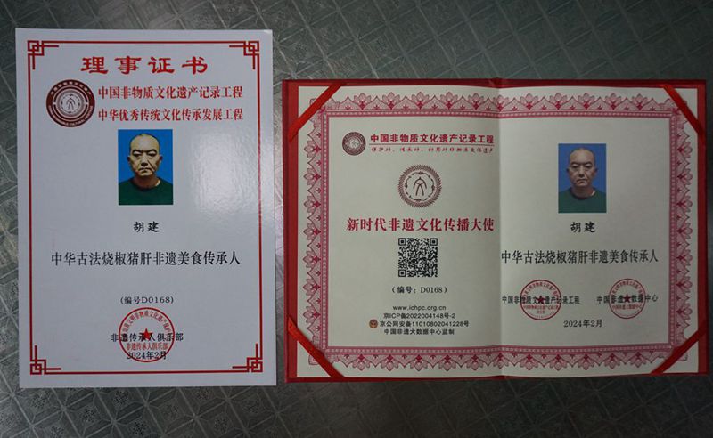 这个牌匾“中华古法烧椒猪肝非遗美食”,是对这道自创菜的肯定;“2024年大众点评必吃榜”的认证,凝聚着食客的口碑;“新时代非遗文化传播大使”的称号,更让小店成为传递重庆传统味道的载体。而胡建,始终保持着初心,每日守在灶台前,专注地烹制每一份餐食。