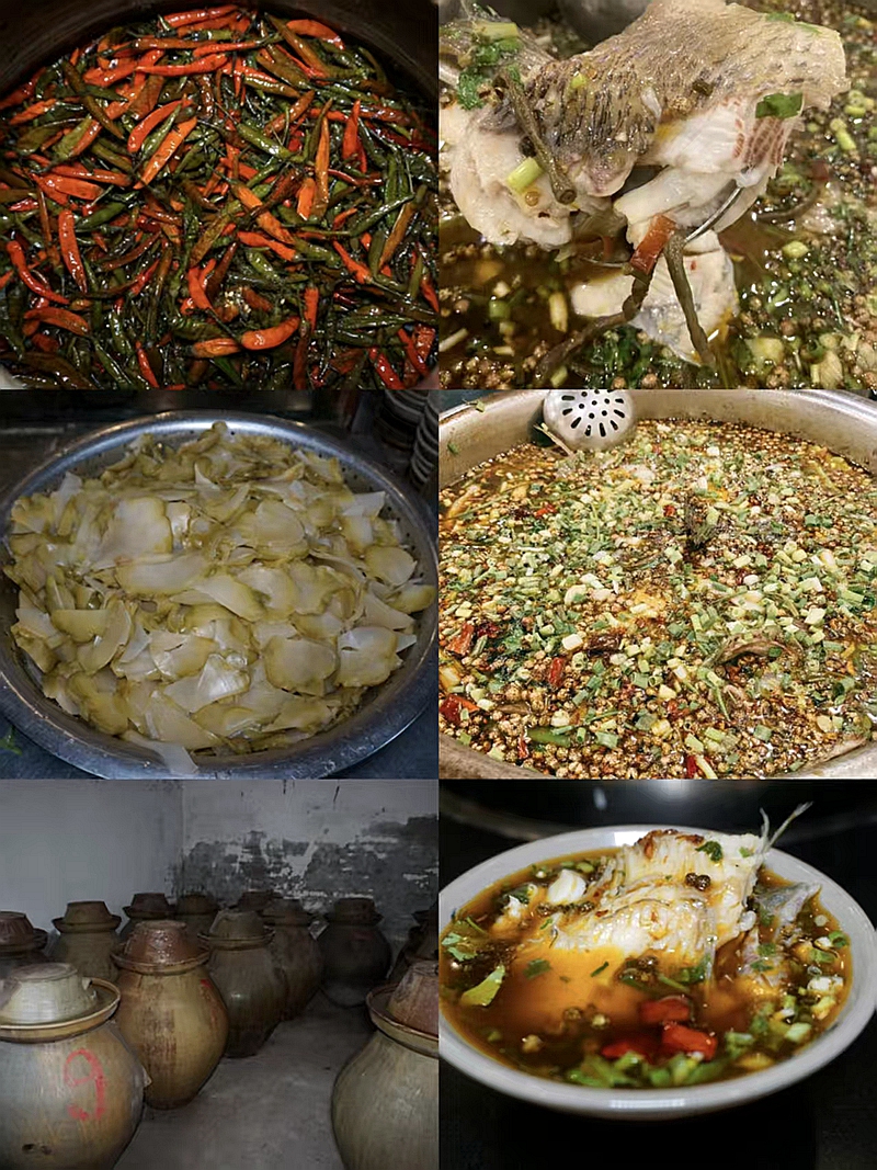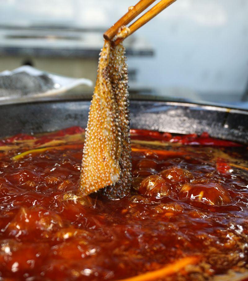 泡椒鱼最关键的步骤是炒制底料,他们自家做的泡菜、泡椒泡姜和市场上买的完全不同,猪油、菜油混合小火慢炒,逼出泡椒的特有香味,把处理好的鱼放入锅中煮熟“香格尔老火锅泡椒鱼”鲜嫩可口。