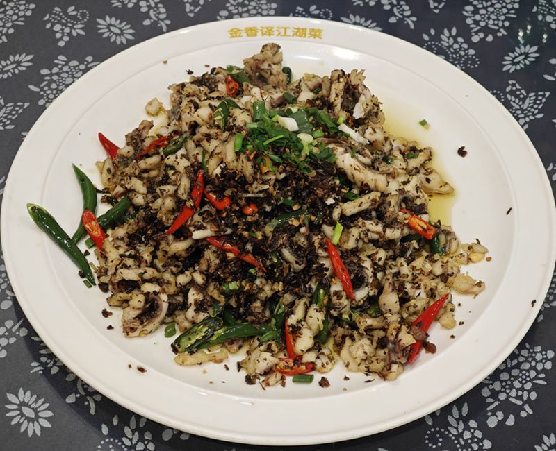 能稳坐江湖菜前排,“金香译”的味道从不含糊,几十年坚守的“急火爆油锁鲜”技艺,正是江湖菜的精髓。招牌芽菜乌鱼花必点:乌鱼现杀现改刀,切成菊花状的鱼肉遇热卷曲绽放,搭配老坛发酵的芽菜与青红椒,高温铁锅中快速翻炒。