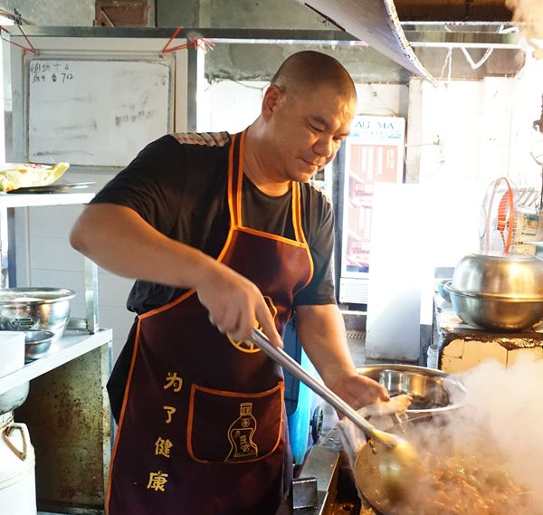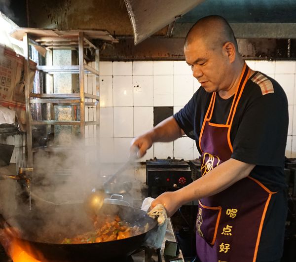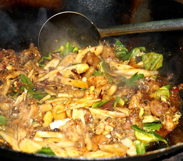 再把已经入味的鸡,倒入特制油中(过河)爆炒,加进一年四季都有,自己泡制的泡仔姜和青椒等配料,大家喜欢的“过河鸡”完成,色香味俱全,回味无穷,20多年经久不衰,其中奥秘就是味好,食材好。