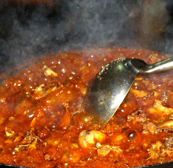 “巴人鸡”的过河鸡,用几种食用油混合成秘制油、天然佐料、鸡肉放入高压锅,一滴水不加,而是倒入黄酒和啤酒。高压锅打开,红彤彤一锅鸡,已经很香了。