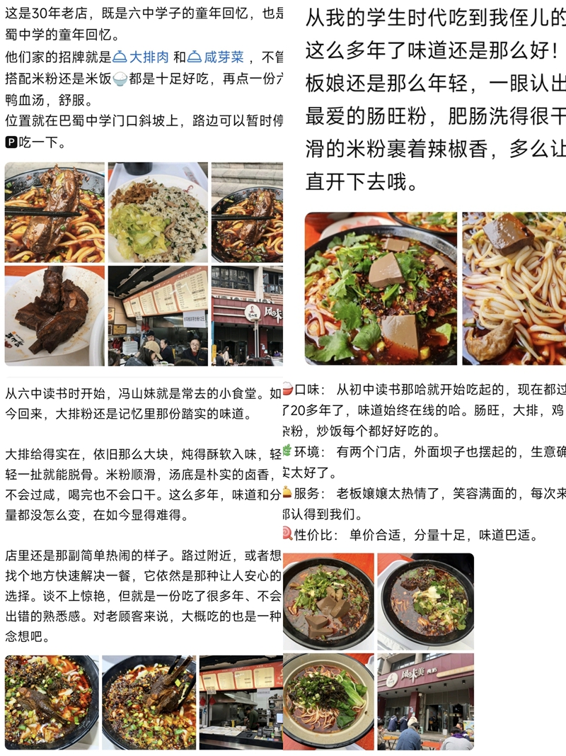 1997年,小店以贵州风味面庄之名,在求精中学旁开门迎客。一碗热粉、一碟炒饭,温暖了无数少年的求学时光。岁月流转,店面迁至巴蜀中学周边,正式定名冯山妹风味美食坊,不变的是坚守与味道。近三十载陪伴,它从校园旁的小馆,成为无数学子心中的“第二食堂”,见证青涩成长,也留住山城温情。